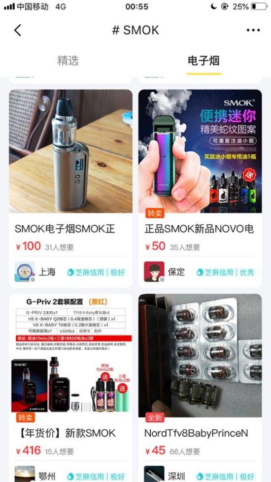 但是,在微博等社交媒体搜索“蒸汽烟”仍旧可以找到相关宣传互动内容。而闲鱼等二手交易平台上,虽然泛指电子烟的关键词不易搜索到电子烟产品,但是如果输入电子烟品牌,如“smok”等,仍旧可以显示相关产品。其中部分并非二手转让,而是标明为“全新正品”,一些卖家还表示量大优惠。