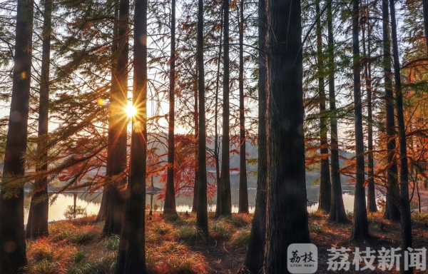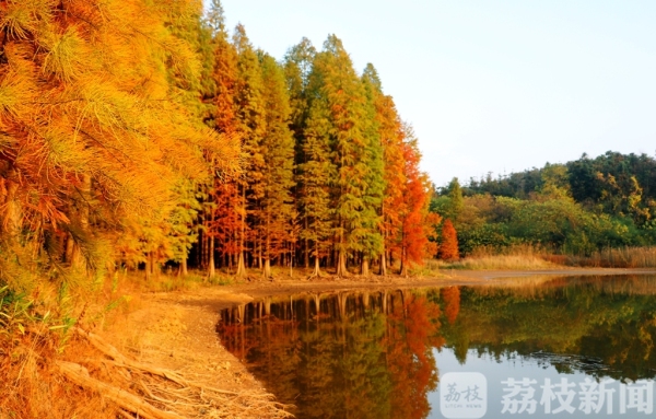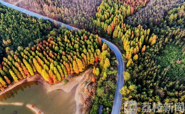 秋冬交替时节,江苏句容东南部的山林间变得五颜六色,特别是在墓东水库上游迎水涧的大片水杉林开始变色,由绿变黄、由黄变红,好似色彩斑斓的油画一般,美不胜收,为这个秋天增添了一道别样的风景。