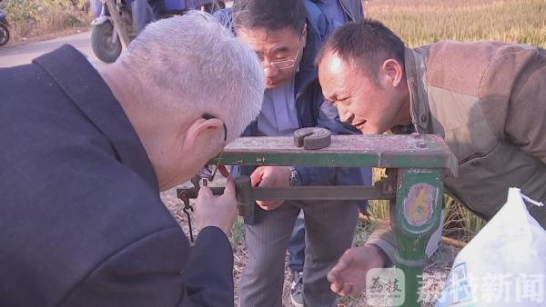 这块水稻田里种植的水稻品种是苏垦118,是2017年刚上市销售的高产新品种,目前在扬州种植推广面积超过20万亩。由于在种植上运用综合种养技术,这里的水稻产量相比其它地块较高。现场,专家对刚刚收割装袋的水稻及时进行称重。