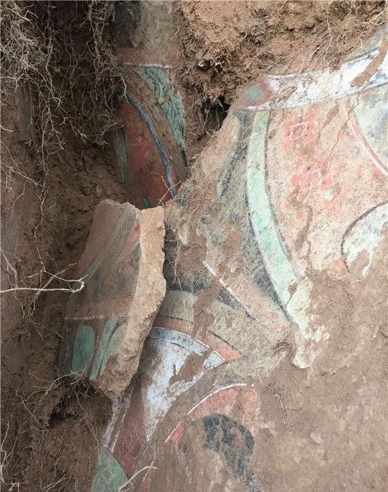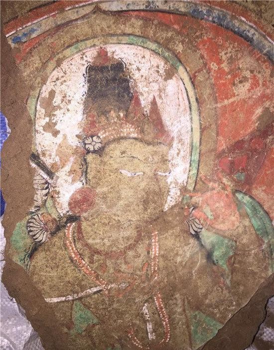 今年六月,在囊谦县香达镇多昌村邦达社的东仓日出地方的施工现场,发现了明显的寺庙建筑遗迹。在山体平面上可以清晰看到5道石砌墙体,在最西端墙内壁出土3块较为完整的壁画,由于当时气候和条件所限,采集以后,碎成50余块大小不等的残片,未来可以根据出土照片予以复原。此次考察的目的是为了确定这批壁画的时代、风格及未来进一步清理和保护的方案。