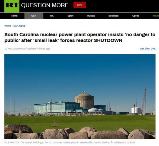 “今日俄罗斯”(RT)12日报道称,美国南卡罗莱纳州一座核电站因泄漏事故被迫无限期停止运行,但核电站的运营者却认为,这次事故非常轻微,没必要告知公众。其表态也引发专家有关“缺乏透明度”的批评。