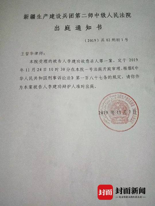 封面新闻记者随后联系了李建功的代理律师、北京典谟律师事务所主任王誓华,王誓华向记者确认已收到法院通知的再审开庭消息。王律师表示,跟据法院通知的安排,开庭前两天将举行庭前会议。记者随后尝试就李建功案开庭消息与第二师法院进行确认,但其对外联系电话始终未能接通。