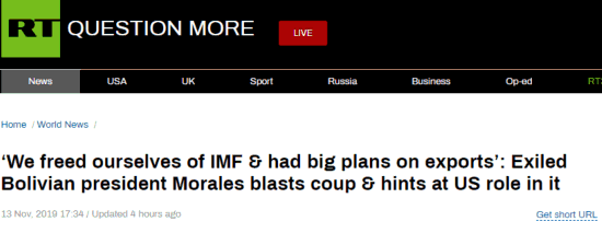 (RT:“我们摆脱了国际货币基金组织的束缚,对出口制定了很多大计划”:流亡的玻利维亚前总统莫拉莱斯抨击“政变”并暗示美国在其中扮演的角色)