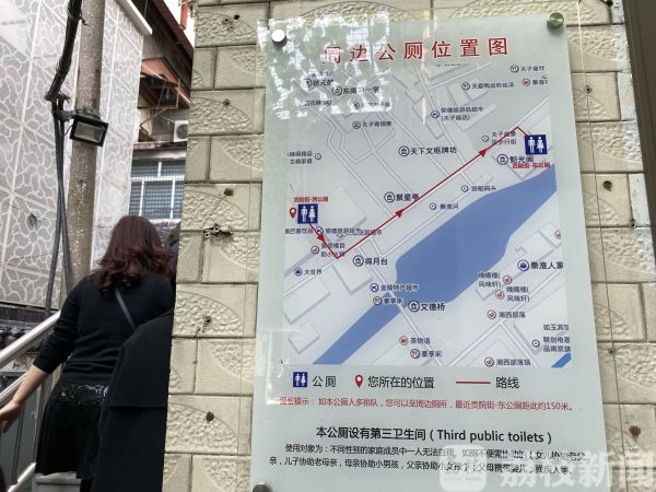 随后记者又来到了南京夫子庙瞻园路的转盘,指示牌显示距离这里最近的卫生间大概在95米左右。