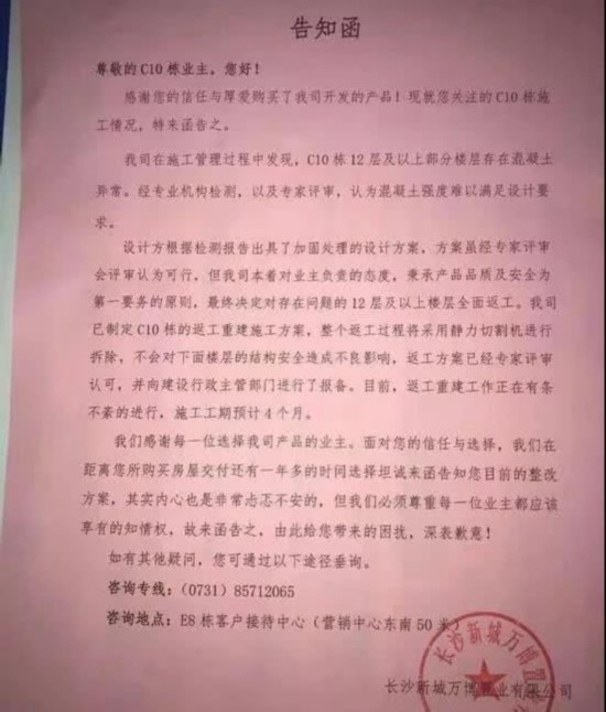 此前的10月28日,长沙新城万博置业有限公司向业主发出《告知函》,解释了“问题混凝土”一事,决定对相关楼层切割拆除并全面返工重建。