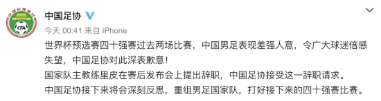 随后,中国足协第一时间通过微博进行回应,接受里皮辞职请求,并向广大球迷道歉。中国足协表示,接下来将会深刻反思,重组男足国家队,打好接下来的四十强赛比赛。