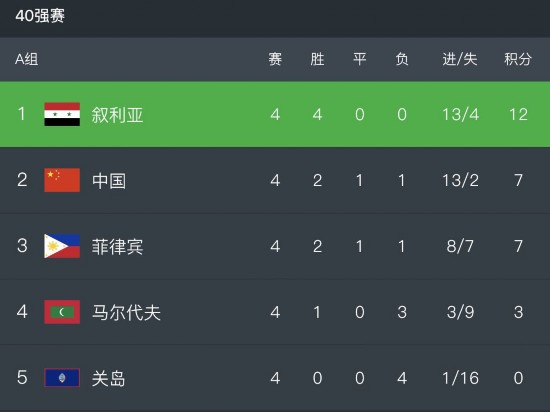 在40强赛A组中,叙利亚队以12分高居榜首,中国队目前仅积7分,以净胜球的优势排在第2位。