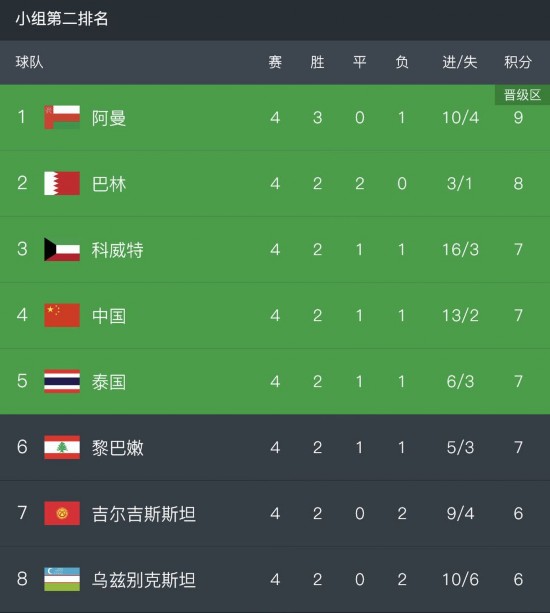 2、以成绩最好的4个小组第二的身份出线(如果东道主卡塔尔队也在晋级范围之内,则改为成绩最好的5个小组第二)。目前,中国队在所有的8个小组第二中排名第4位,离被淘汰只有一步之遥。