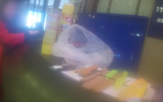 安检员将情况通报给执勤民警。当着民警的面,李某从自己的黑色外套内接连掏出4个压力罐和一塑料袋的刀具。经工作人员检查,共有剪刀1把,各种刀具12把,其中一把还是管制刀具。