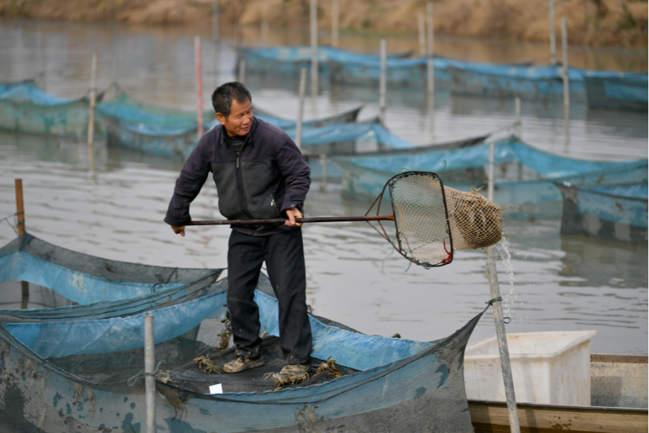 马广金在塘口捕捞螃蟹