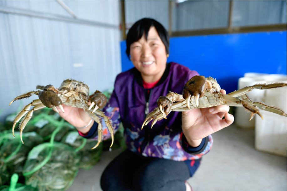 村民展示刚捞上来的螃蟹