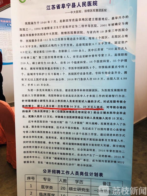 阜宁县人民医院直接在海报上划出重点“试用期考核合格的博士、硕士人员分别一次性奖励50万元、20万元”,“四证合一”的人员还有额外的奖励。不仅如此,这家医院甚至还设立了“伯乐奖”,给成功引荐紧缺全日制医学博士研究生、硕士研究生的中介机构、社会组织和个人,奖励5000至50000元。