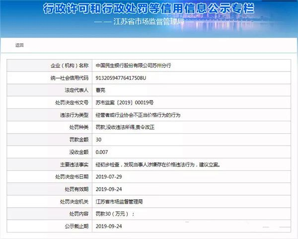 同时,江苏省市场监督管理局对民生银行苏州分行罚款30万元,没收违法所得0.007万元。处罚决定书于2019年7月29日作出,公示截止日期为9月24日。