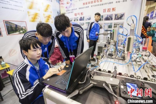 图为参会的职业院校学生展示数控操作技能 王威 摄
