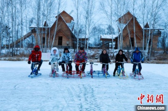 游客体验冰上自行车娱乐项目。王景阳 摄