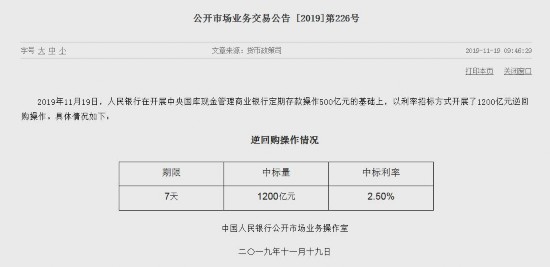 央行网站公告称,11月19日,人民银行在开展中央国库现金管理商业银行定期存款操作500亿元的基础上,以利率招标方式开展了1200亿元7天逆回购操作,中标利率为2.50%,与上一次持平。19日无逆回购到期,因此净投放1200亿元。