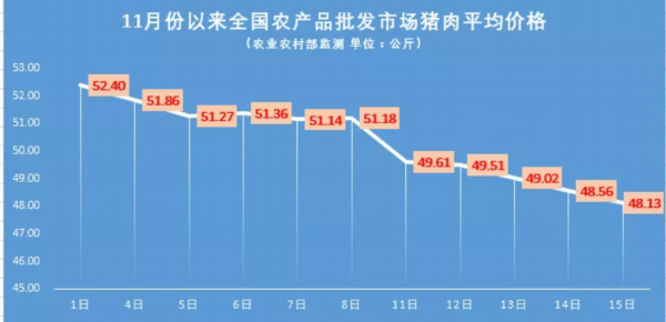 11月15日,全国农产品批发市场猪肉平均价格为48.13元/公斤,相比于14日下降了0.9%。如此算来,进入11月份,猪肉价格已连续多日下降。