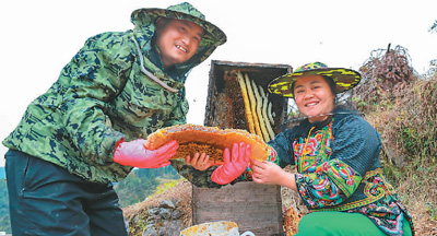 龙先兰夫妇在查看蜂巢。