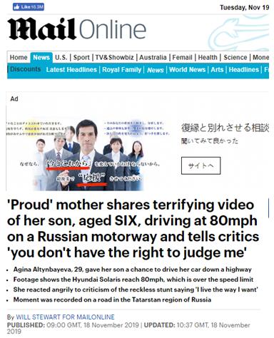 据报道,在接到一些网友报警后,当地警方和儿童保育机构正在对阿吉娜展开初步调查。“首先,该女子将接受俄罗斯交警的问话,交警将根据问话采取明确的措施。如果这些措施被证明是不够的,我们将考虑请这位母亲前往青少年事务委员会开会。”当地政府部门称。