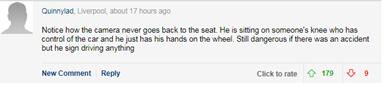 “请注意,为什么镜头一直没有照到座椅。这个男孩是坐在某人的膝盖上,一定有别人在开车,而男孩只是把手放在方向盘上而已。这个男孩并没有在开车,但如果发生事故的话仍然很危险。”