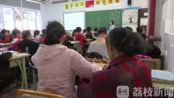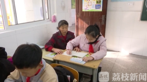 在刘雯佳的班级里,记者见到了这位特别的"同桌",原来她就是刘雯佳55岁的外婆陈阿粉。陈阿粉说:“她要画线,什么东西的,她手不方便拿尺子,我在旁边帮她摆尺子。”