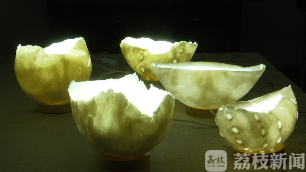 这些形如弯月、用陶艺制成的台灯,接上电源后可调节亮度,有一个浪漫的名字"静夜思"。