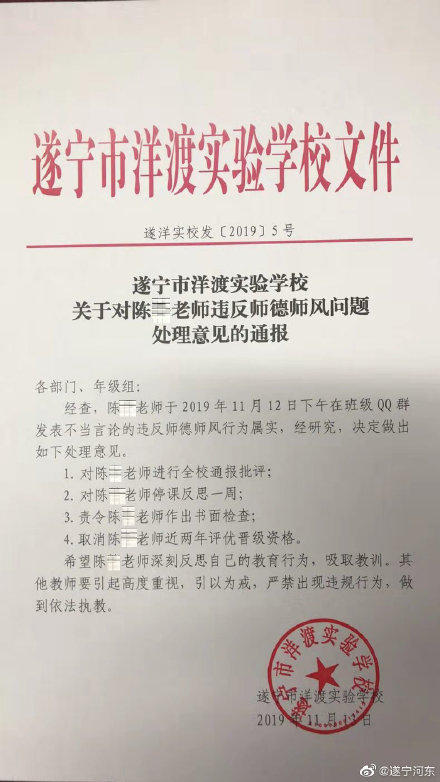 遂宁市河东新区官方微博在该条微博留言区所附的一份处理意见显示,11月13日,遂宁市洋渡实验学校发布了《关于对陈老师违反师德师风问题处理意见的通报》,经研究决定,对该教师做出如下处理意见:全校通报批评、停课反思一周、做出书面检查、取消近两年评优晋级资格。