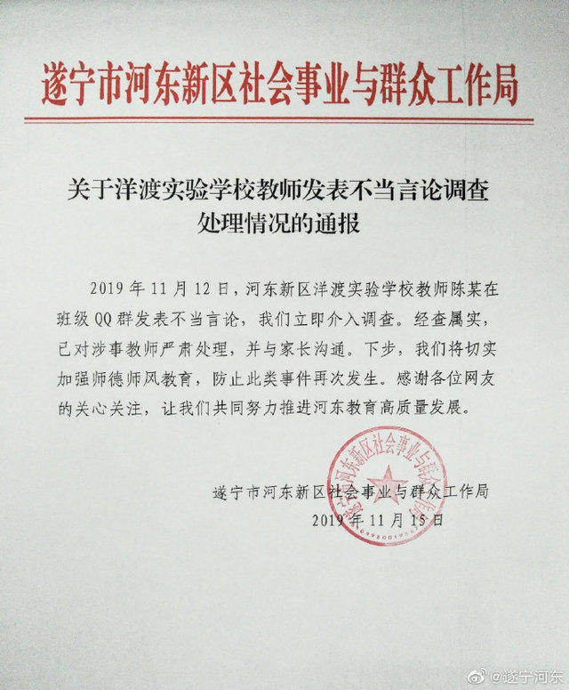 11月15日,四川省遂宁市河东新区官方微博发布通报称,该区洋渡实验学校教师陈某在班级QQ群发表不当言论,已对涉事教师严肃处理。