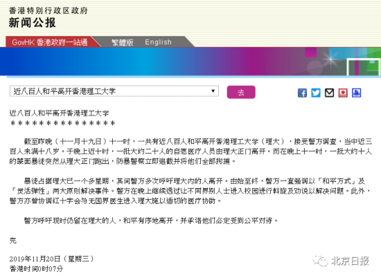 期间,也有学生在教育界人士陪同下自愿离开校园,接受警方登记。截至19日晚11时,共有近800人和平离开理大,接受警方调查,当中近300人未满十八岁。