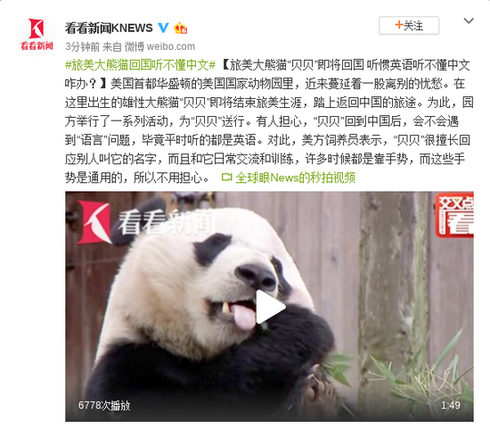 美国首都华盛顿的美国国家动物园里,近来蔓延着一股离别的忧愁。在这里出生的雄性大熊猫“贝贝”即将结束旅美生涯,踏上返回中国的旅途。为此,园方举行了一系列活动,为“贝贝”送行。有人担心,“贝贝”回到中国后,会不会遇到“语言”问题,毕竟平时听的都是英语。对此,美方饲养员表示,“贝贝”很擅长回应别人叫它的名字,而且和它日常交流和训练,许多时候都是靠手势,而这些手势是通用的,所以不用担心。