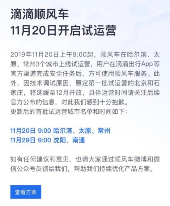 今日(11月20日)上午9点起,滴滴顺风车在哈尔滨、太原、常州3个城市上线试运营。当地用户在使用顺风车服务前,首先要在端内完成包括实名信息认证、安全功能确认、乘客安全知识学习三部分在内的安全任务,且需要进行人脸认证。同时由于技术调试原因,原定第一批试运营的北京和石家庄,将延缓至12月开放。