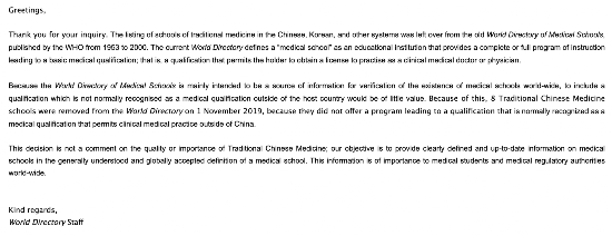 “世界医学院名录主要是作为核查世界各地医学院校情况的信息来源,收录一个在东道国以外无法受到普遍认可的医学资质是毫无价值的。正因为如此,2019年11月1日,有8所中医学校被从世界医学院校名录中删除,因为它们没有提供通常可被允许在中国境外进行临床执业的医学资质的课程。”WDMS指出。
