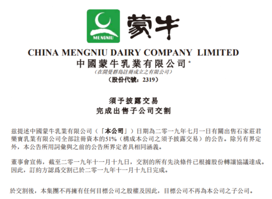 11月20日,蒙牛乳业宣布出售石家庄君乐宝乳业有限公司51%股权完成交割,这意味着君乐宝正式脱离蒙牛子公司的身份,公司控制权重回创始人魏立华手中。