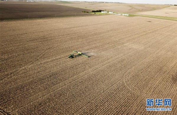 4月25日,在美国艾奥瓦州卡斯县大西洋镇,一台播种机在农场进行作业。新华社发