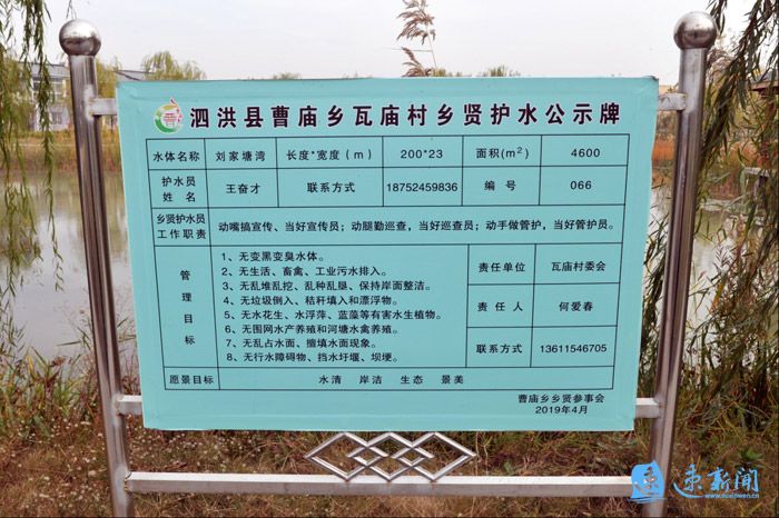 11月19日,位于泗洪县曹庙乡瓦庙村刘家塘湾的乡贤护水公示牌。