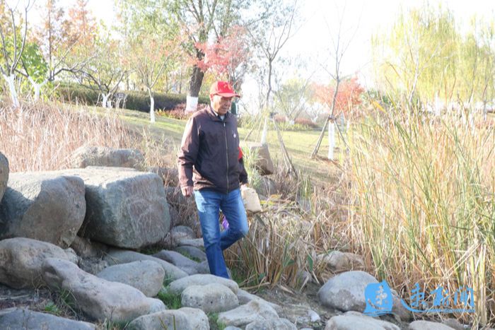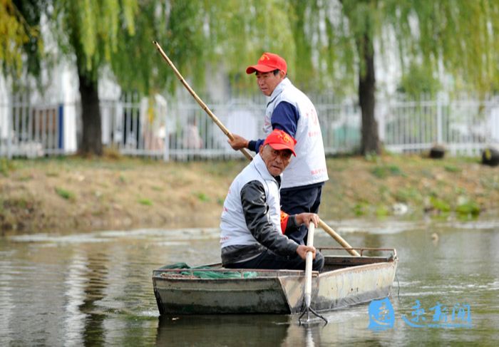 11月19日,乡贤护水员在泗洪县界集镇生态公园湖面清理漂浮物。