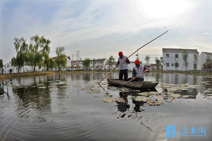 11月19日,泗洪县龙集镇应山居委会,乡贤护水员在应山小区池塘内清理垃圾。