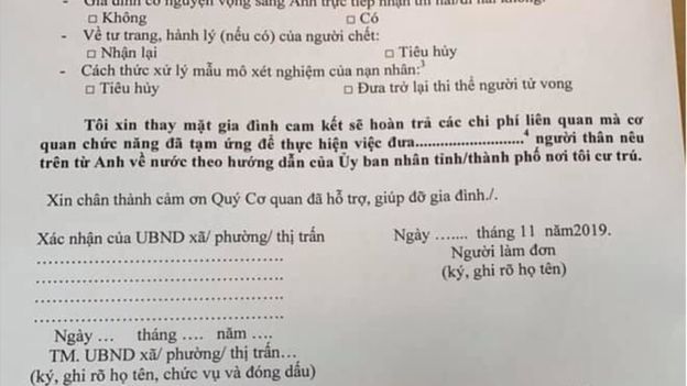英国“死亡货车”遇难者的家属说,越南当局正在给他们提供两个选择:向政府贷款,或自行承担遗骸归国费用。
