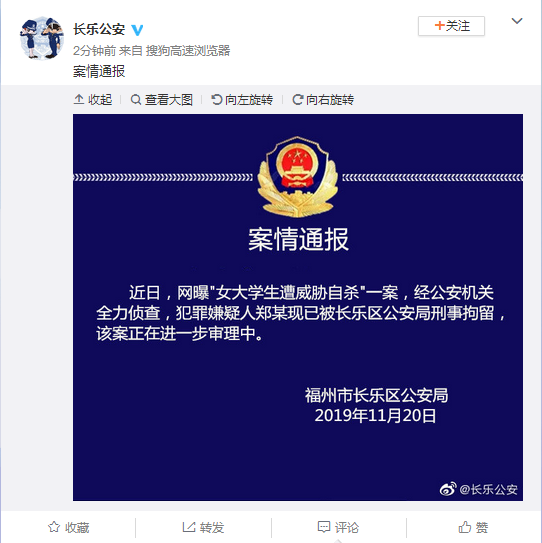 荔枝新闻讯 据福州市长乐区公安局官方微博消息,近日,网曝“女大学生遭威胁自杀”一案,经公安机关全力侦查,犯罪嫌疑人郑某现已被长乐区公安局刑事拘留,该案正在进一步审理中。