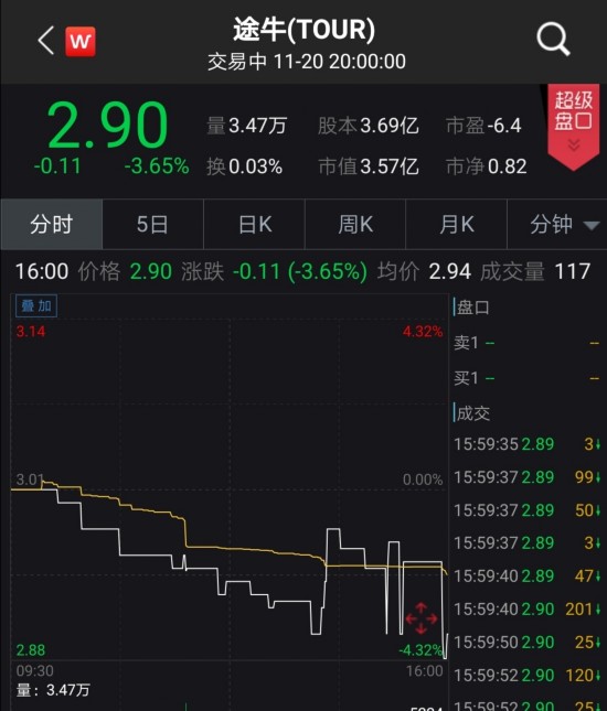 Wind数据显示,截至20日收盘,途牛股价下跌3.65%,每股报2.90美元。