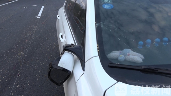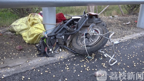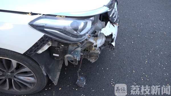 一辆电瓶车卡在路边护栏的下面,车右后角因受到严重的撞击而弯曲变形,后轮盘破碎。一辆白色轿车停在由南向北的快车道里,车右前角处损坏严重,大灯灯罩破碎,右侧反光镜脱落,前挡风玻璃右侧破碎,破碎的塑料挡板与电瓶车上携带的物品散落一地,占据了由南向北的车道。