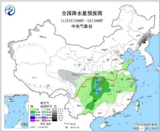 图5 全国降水量预报图(11月24日08时-25日08时)