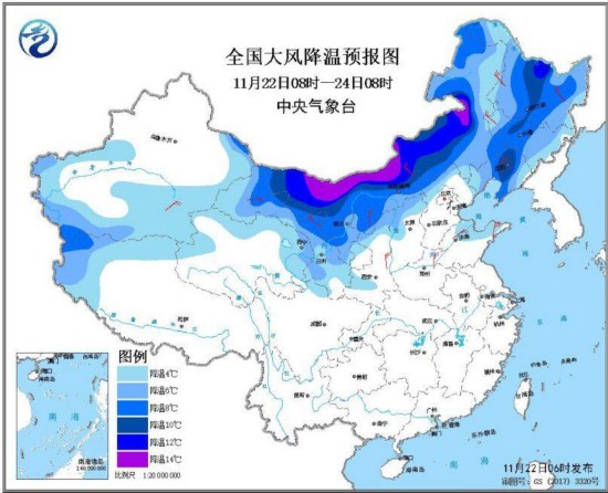 预计,11月22日08时至24日08时,受较强冷空气影响,新疆南疆盆地、青海北部和东部、西北地区东部、内蒙古、东北地区大部、山西北部、河北北部、山东北部等地气温将先后下降4~8℃,其中内蒙古、黑龙江中西部、辽宁北部等地的部分地区降温可达10~12℃,局地14℃以上;上述部分地区有4~5级偏北风、阵风6~7级(见图1)。中央气象台11月22日06时继续发布大风降温预报。