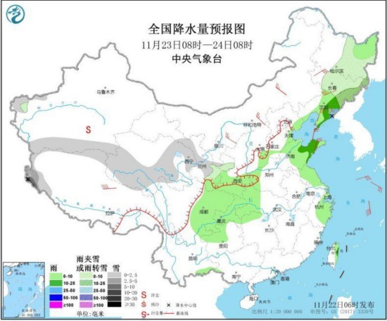 图3 全国降水量预报图(11月22日08时-23日08时)