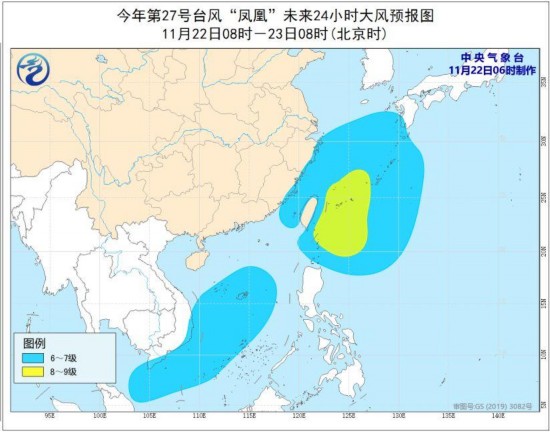 受台风“凤凰”影响,22日08时至23日08时,浙江沿海、福建沿海、台湾沿海、台湾海峡、东海大部、台湾以东洋面、巴士海峡、南海中南部、西沙群岛和中沙群岛将有6~7级大风, 其中,台风中心经过的附近海域风力可达8~10级,阵风11~12级(见图2)。中央气象台11月22日06时继续发布台风预报。