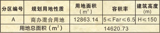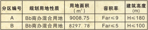 规划要点:地块分A、B两个区域,均为商办混合用地。其中A地块用地面积9008.75㎡;B地块用地面积8297.78㎡。