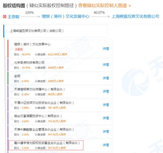 天眼查数据显示,上述这一案件的执行申请人嘉兴璟字悌为股权投资基金合伙企业(有限合伙)为熊猫互娱的股东,持股比例为2.31%。而熊猫互娱的实控人、董事长为王思聪,其通过全资控股珺娱(湖州)文化发展中心持有熊猫互娱40.07%的股份。