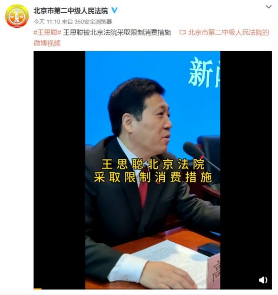 文件显示,北京市第二中级人民法院于11月4日立案执行申请人嘉兴璟字悌为股权投资基金合伙企业(有限合伙)申请执行王思聪国内非涉外仲裁裁决一案,因王思聪未按执行通知书指定的期间履行生效法律文书确定的给付义务,按照相关规定,对王思聪采取限制消费措施。如违反限制消费令,经查证属实的,将依照《中华人民共和国民事诉讼法》第一百一十一条的规定,予以罚款、拘留;情节严重,构成犯罪的,依法追究刑事责任。