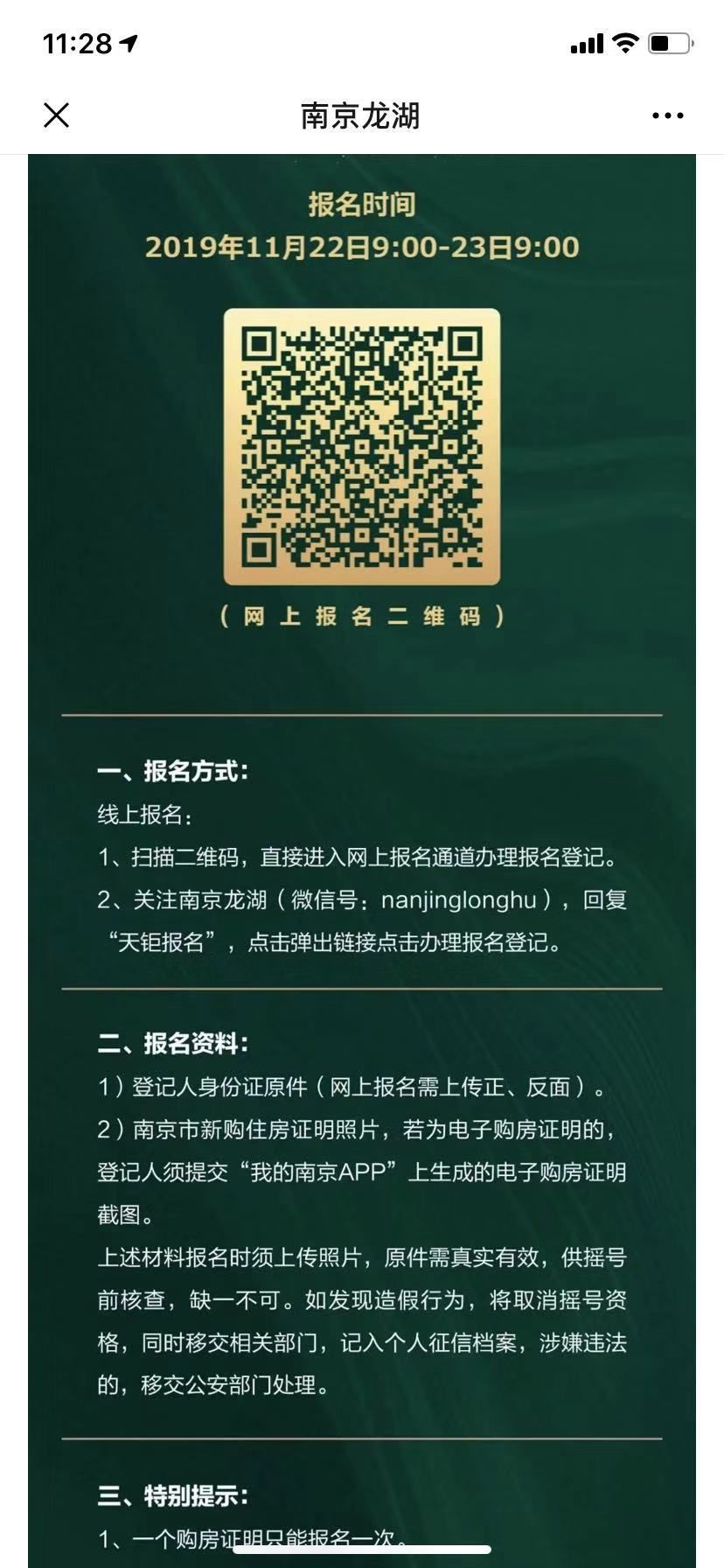 项目登记时间:11月22日9:00-11月23日9:00 登记方法:关注微信公众号【南京龙湖】(微信号:nanjinglonghu),点击摇号报名通道文章链接,按页面上公示的方法及规则报名。