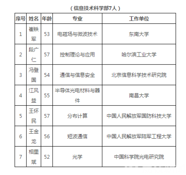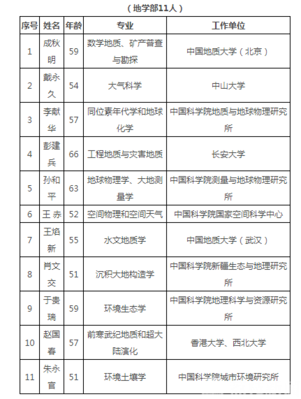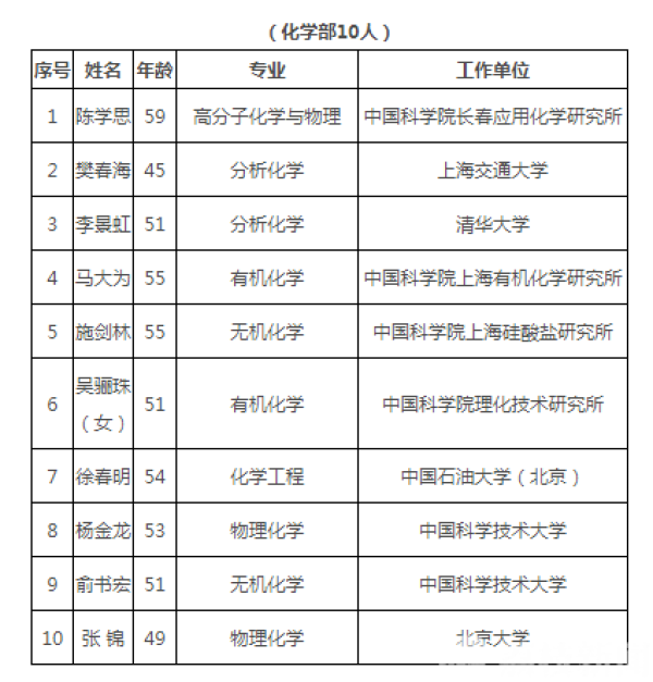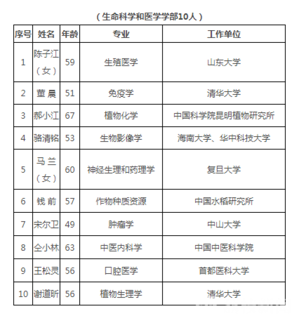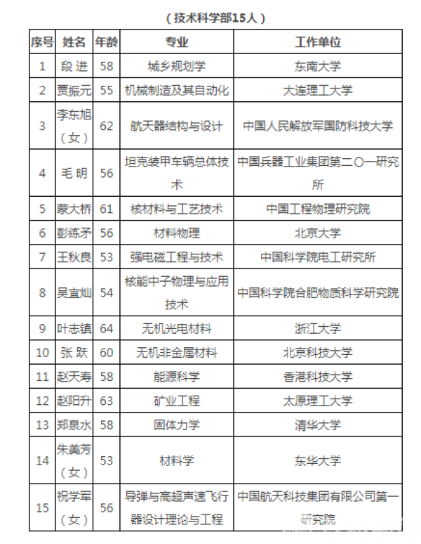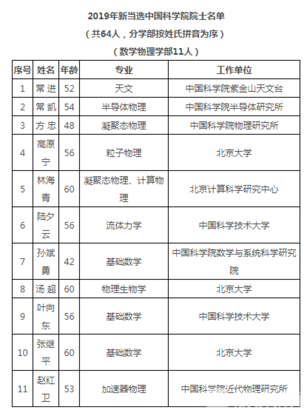 据了解,2019年中国科学院院士增选工作于2019年1月1日正式启动,经过推荐、通信评审、公示、会议评审以及全体院士终选投票等程序,2019年共产生中国科学院院士64名。其中,数学物理学部11人,化学部10人,生命科学和医学学部10人,地学部11人,信息技术科学部7人,技术科学部15人。新当选院士中,女性6名;平均年龄55.7岁,最小年龄42岁,最大年龄67岁,60岁(含)以下的占87.5%。